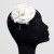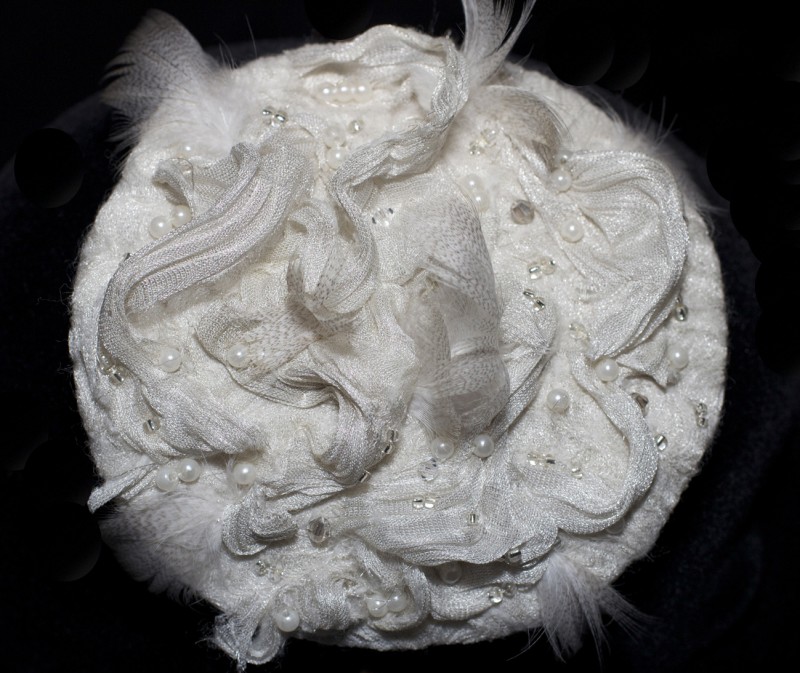 Beige/grey textured fabric small flat pill box with ruffled fabric, beads and feathers