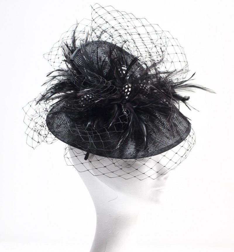 Black straw twist head piece with black veiling, black and guinea fowl feathers