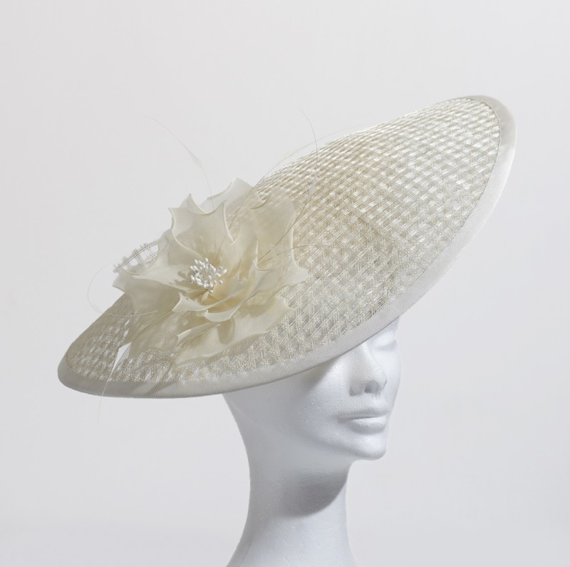 Cream window sinamay mid disc hat with cream flower trim and feathers