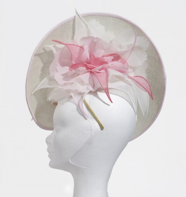 White pinok pok curved tilt disc hat with ivory and pink petal flower trim