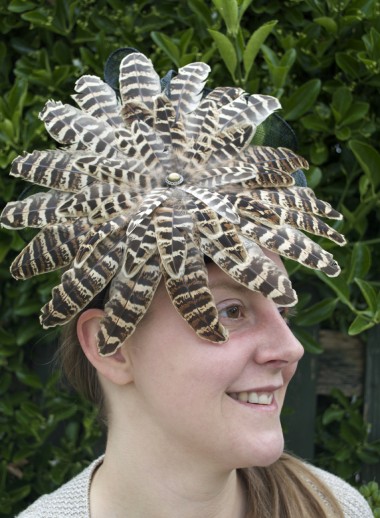 Black felt pill box with medium pheasant wing feather wheel and black ruffled sinamay behind