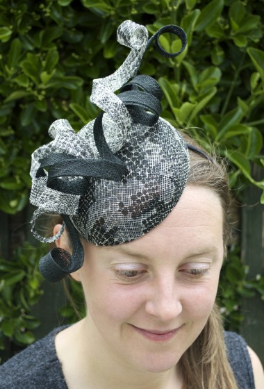 Black and white snake print sinamay pill box with black and snake print coils
