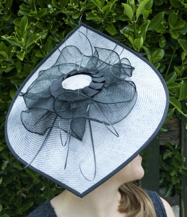 Grey straw, oval diamond tilt disc with black bind and ruffle sinamay trim