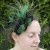 Navy felt ruffle with green organdie petals and peacock feather bunches