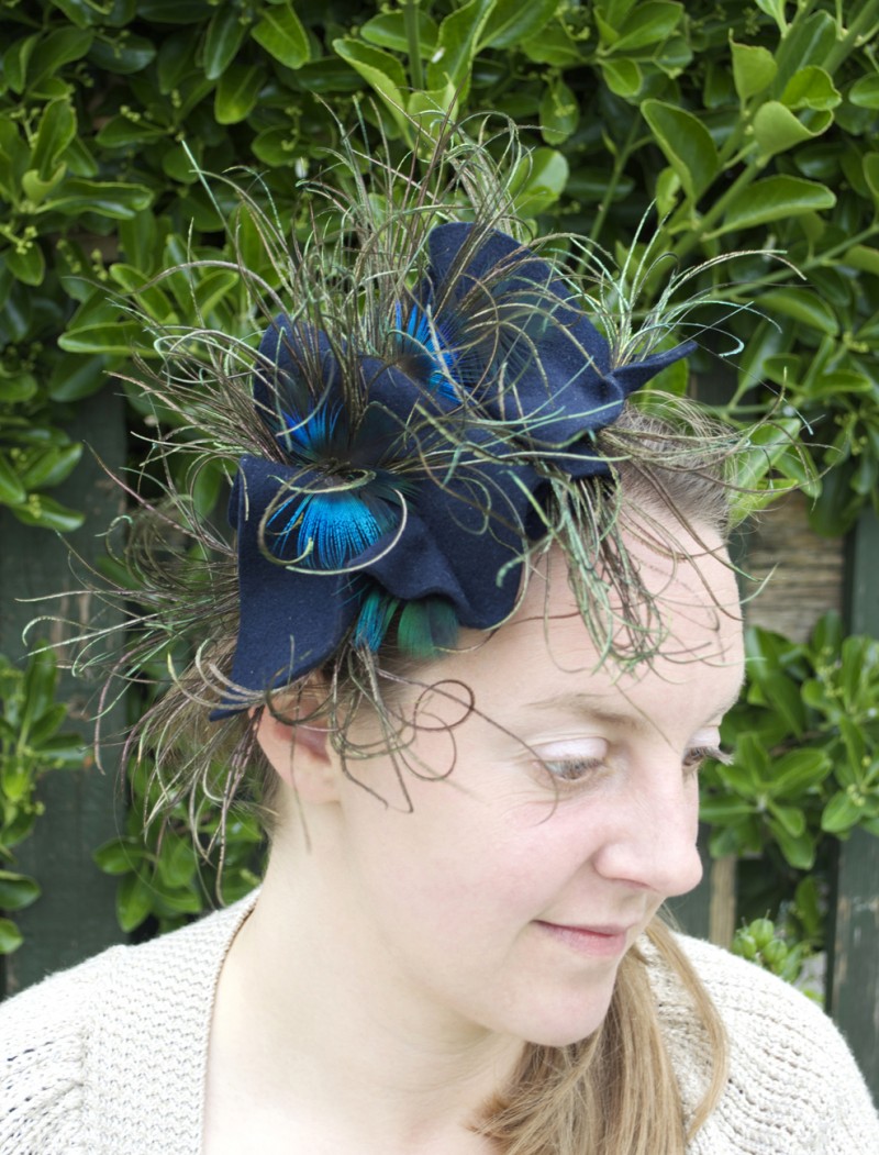 Navy felt ruffle with peacock feather bunches and blue feathers