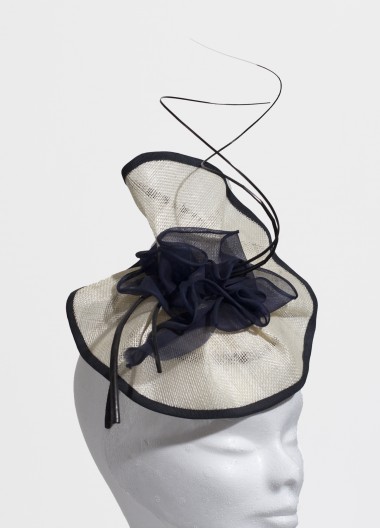 Cream and dark navy ruffled sinamay head piece with curled quills