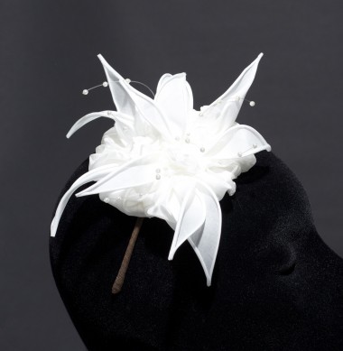 Ivory ruffled fabric small base with ivory pointy petals and pearl stamens