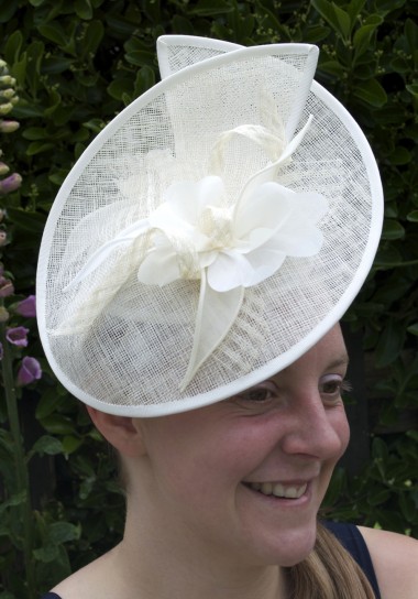 Cream window sinamay small cut disc, with coils and cream flower petal trim