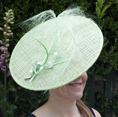 Light green window sinamay flat disc, with curled burnt ostrich feathers and straw coils