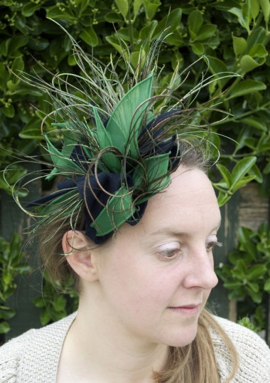 Navy felt ruffle with green organdie petals and peacock feather bunches